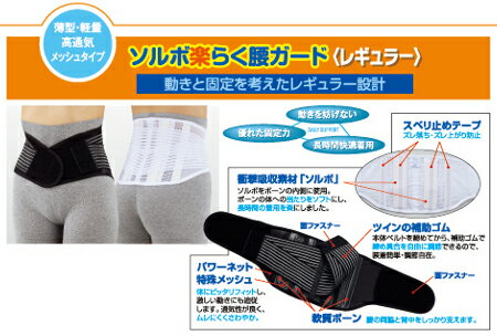 サイズ/ ウエスト S 58〜78cm M 68〜88cm L 78〜98cm 2L 88〜108cm ◆ 素材: 本体/ナイロン パワーネット/ナイロン、ポリウレタン 補助ゴム/ナイロン、ポリウレタン 軟質ボーン/ポリプロピレン パッド/ポリウレタン(ソルボ) ◆ カラー:ブラック/ホワイト ◆ 製造元:ソルボ/三進興産 ◆ 商品番号:3766 ソルボ 楽らく腰ガード レギュラー ■ 薄型・軽量・高通気メッシュタイプ ■ 動きやすさと固定力のバランスを考慮したレギュラーサイズ設計 ■ 本体ベルトとツインの補助ゴムで締め具合を自由に調整 ■ 軟質ボーンが腰の両脇と背中をしっかり支えます。