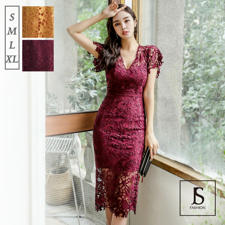 レース ワンピース 刺繍 Vネック シースルー 半袖 総レースワンピース ミディアム丈 きれいめ セクシー 大きいサイズ 謝恩会 結婚式 タイト ワンピース パーティードレス 春 夏 秋冬【220203】