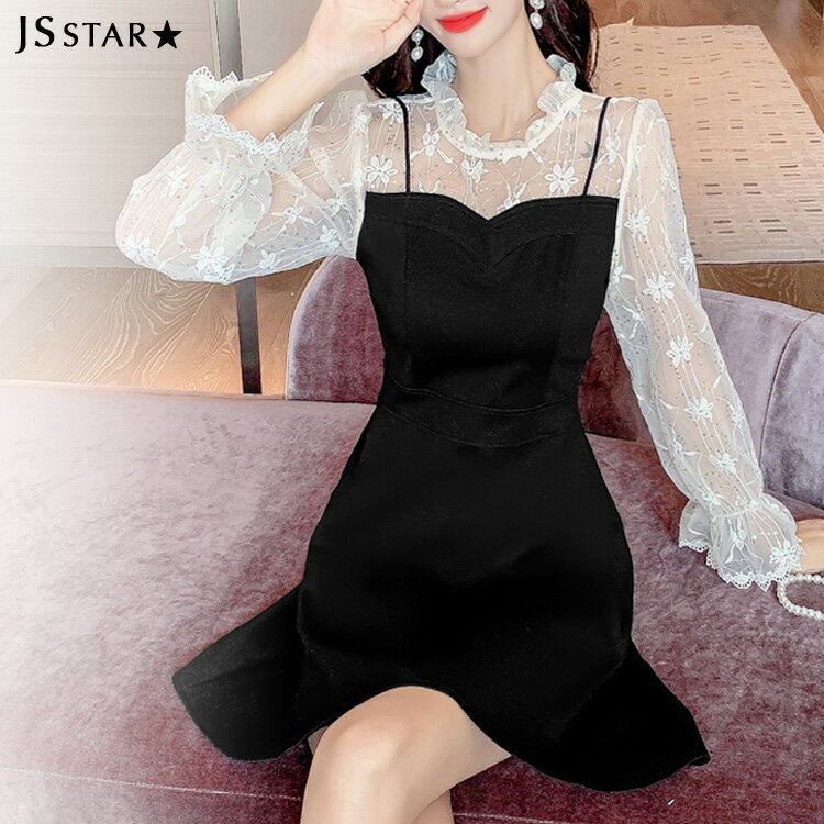 ワンピース パーティードレス レイヤード風Aラインワンピース 刺繍 ショート丈 ミニ丈 シースルー 黒 長袖 きれいめ 秋 冬 華やかおしゃれ お呼ばれドレス 結婚式 謝恩会 同窓会 二次会 発表会 お呼ばれ 可愛い