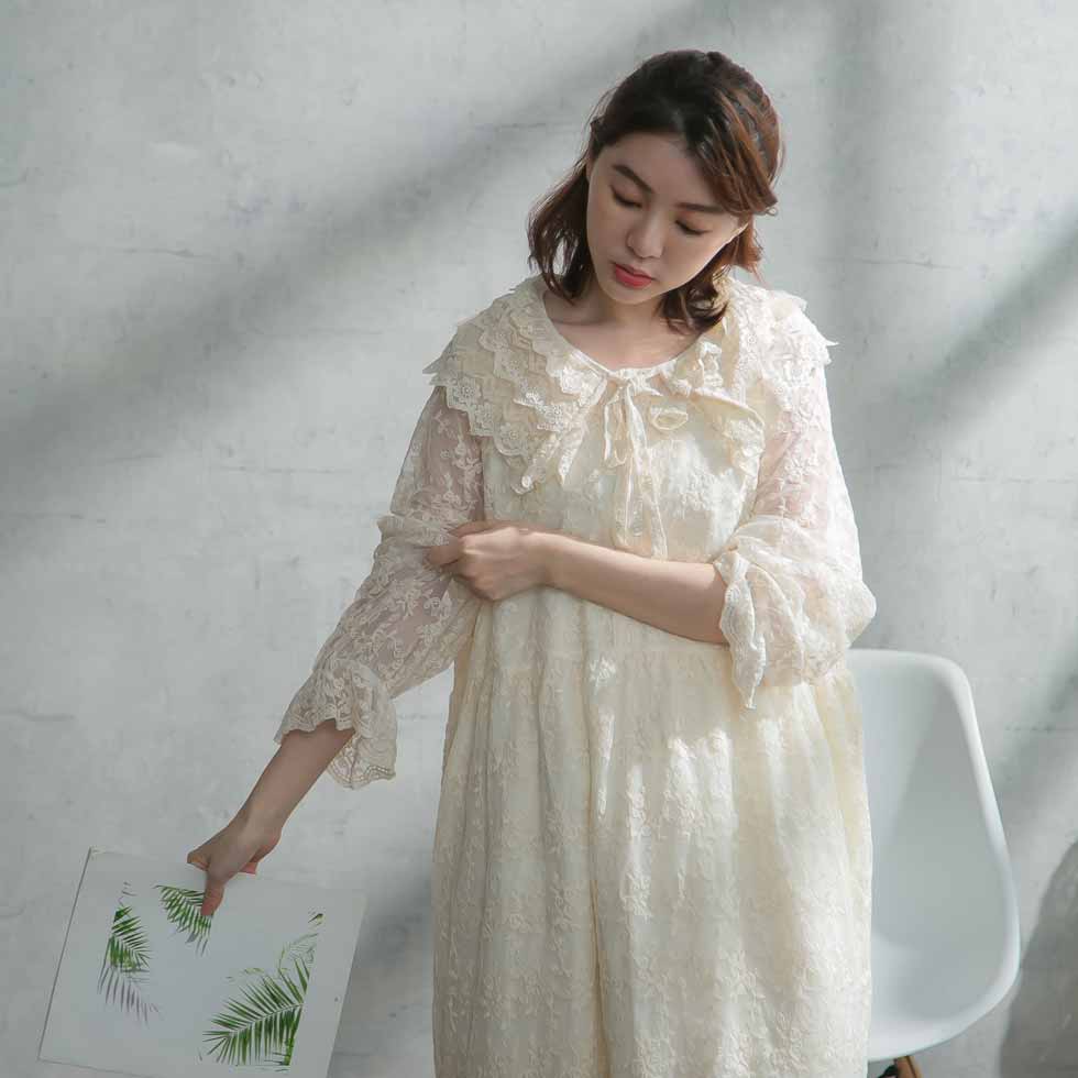 【 春夏特集 】【 再販売 】 心躍る 総レース セーラー ワンピース 【 生成り 薄黄色 】全1色】 丸襟 映え 刺繍 レース 九分袖 シースルー 裾 袖 見せ コットン100% 綿100% 天然素材 スカラップレース 春服 春物 春用 春夏 夏服 夏物 夏用
