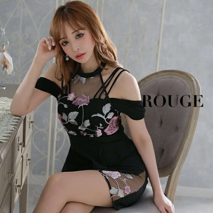 送料無料 キャバドレス 大きいサイズ s m l xl サイズ ドレス ミニ ワンピース タイト ペプラム オープンショルダー ハイネック 花柄 フラワー 刺繍 シースルー サイドシアー キャミソール ブラック 【ROUGE | ルージュ】あす楽 ミニドレス 7043SB-2006-1