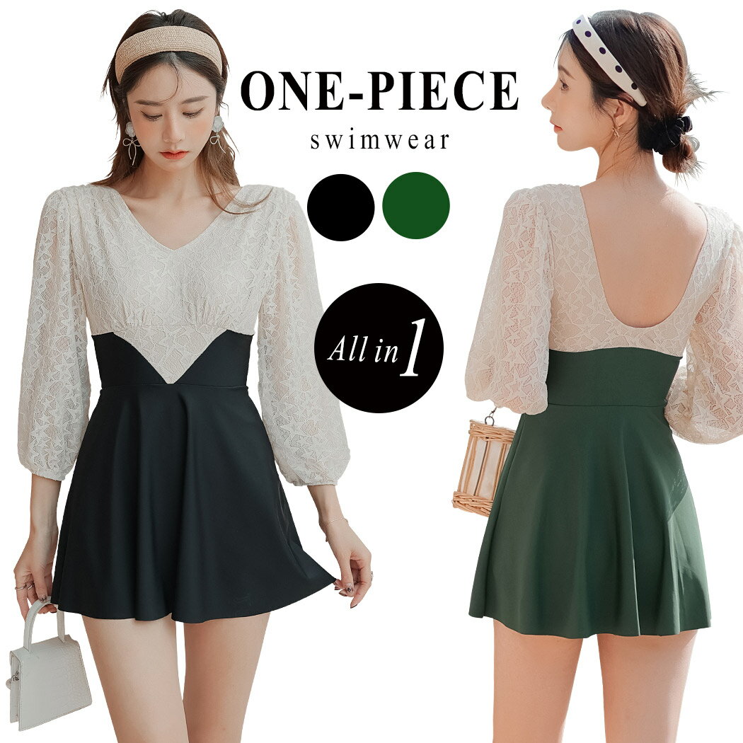 水着 レディース 長袖 ワンピース 体型カバー おしゃれ かわいい 透け シースルー スター レース 刺しゅう ノンワイヤー バックシャン バイカラー ハイウエスト 一体型 ショートパンツ バルーン袖 二の腕 ウエスト ヒップ 太もも カバーアップ