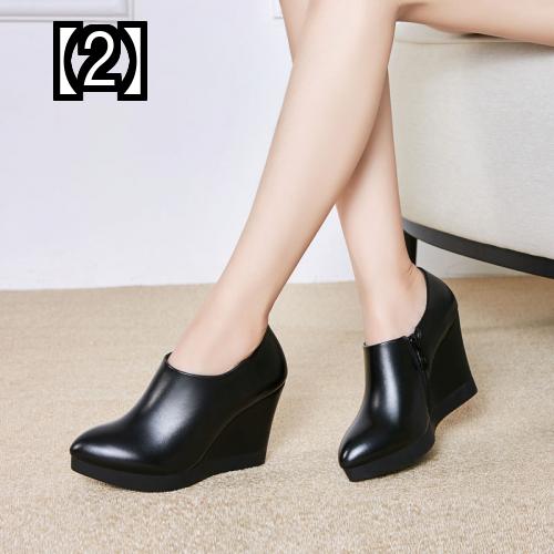 秋 ブーツ 痛くない レディース ウェッジ ヒール 牛革 アンクル 防水 プラットフォーム シューズ 靴 ブラック