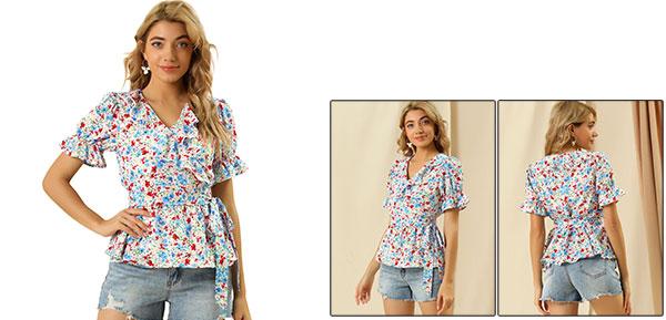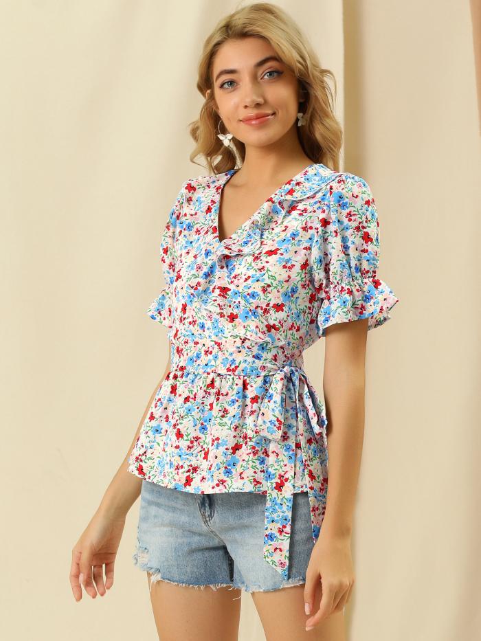商品詳細 特徴 【属性1】フルーツ柄、クロスオーバーVネック、フリル、パフスリーブ、ウエストリボン、ペプラム、ラップブラウス【属性2】共布のベルトは締められたスリムなウエスト感じがします。