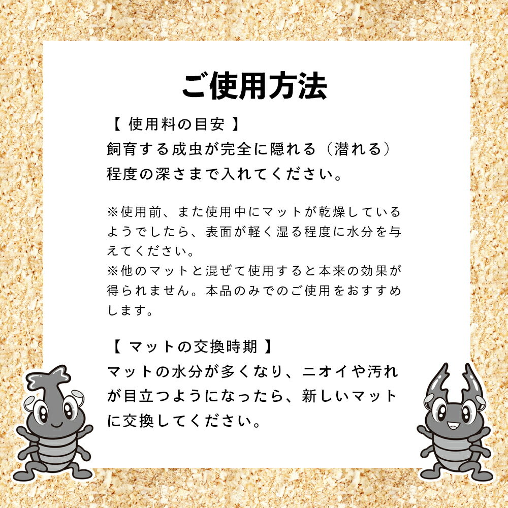 ご使用方法 【 使用料の目安 】 飼育する成虫が完全に隠れる(潜れる)程度の深さまで入れてください。
