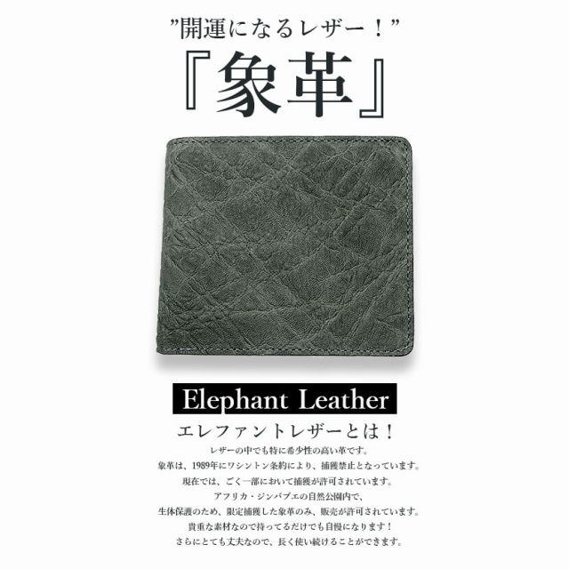 【サイズ】 縦幅:9.8cm 横幅:11.5cm マチ:2cm 【仕様】 お札入れ :2ヶ所 小銭入れ :1ヶ所 カード入れ :3ヶ所 フリーポケット:3ヶ所 ■素材:外側:象革 / 内側:牛革 ■生産地:日本 ■パッケージ:個別箱 【Elephant Leather】 エレファントレザー レザーの中でも特に希少性の高い革です。