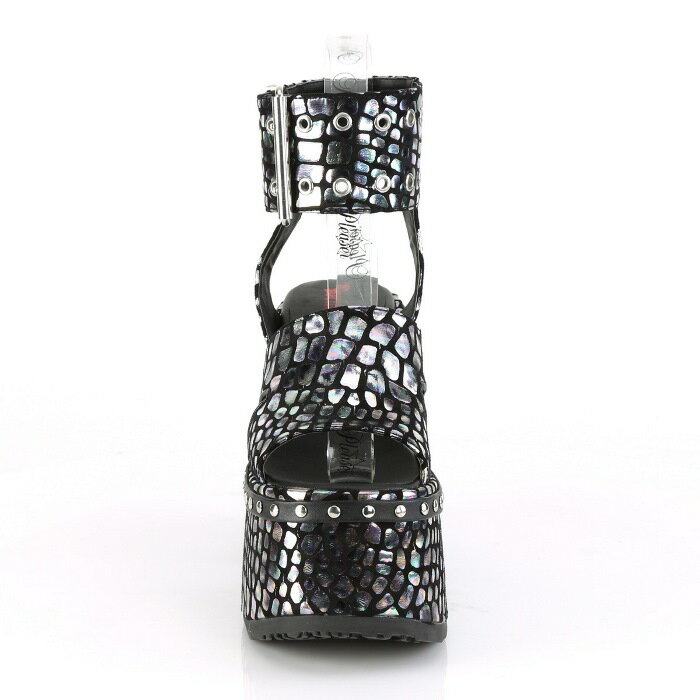 demonia デモニア サンダル 厚底 13 cm ヒール 黒 ブラック 銀色 シルバー ホログラム ワイドアンクルストラップ メタルスタッズ 小さいサイズ 大きいサイズ チャンキーヒール 厚底靴 パンク ゴスロリ 原宿系 靴 レディース メンズ CAMEL-102 CAM102/BNB-SHG 取寄